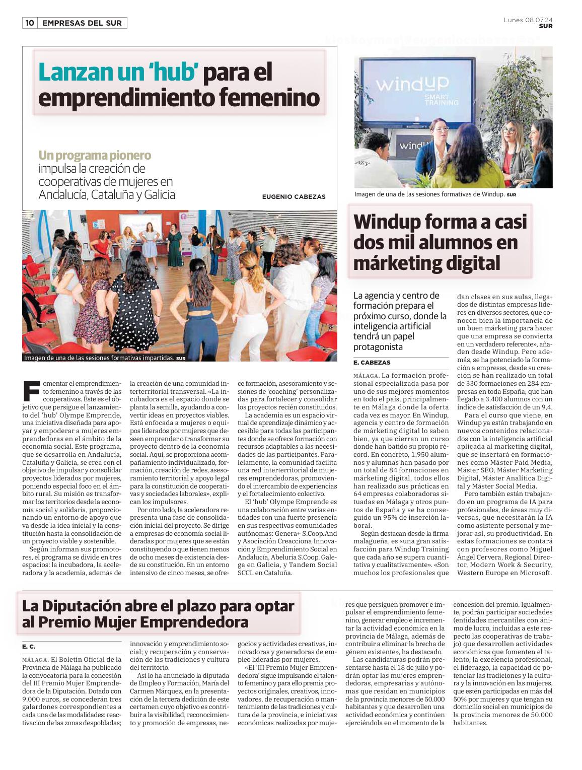 Nuestra labor como asociación comprometida con el emprendimiento social y la igualdad ha sido reconocida en diversos medios de comunicación. Una de las noticias más destacadas ha sido nuestra participación en Olympe Emprende, un programa pionero que impulsa la creación de cooperativas lideradas por mujeres en Andalucía, Galicia y Cataluña. Este proyecto visibiliza el poder transformador del emprendimiento femenino en el ámbito de la economía social, y refuerza nuestra apuesta por generar impacto real en los territorios.